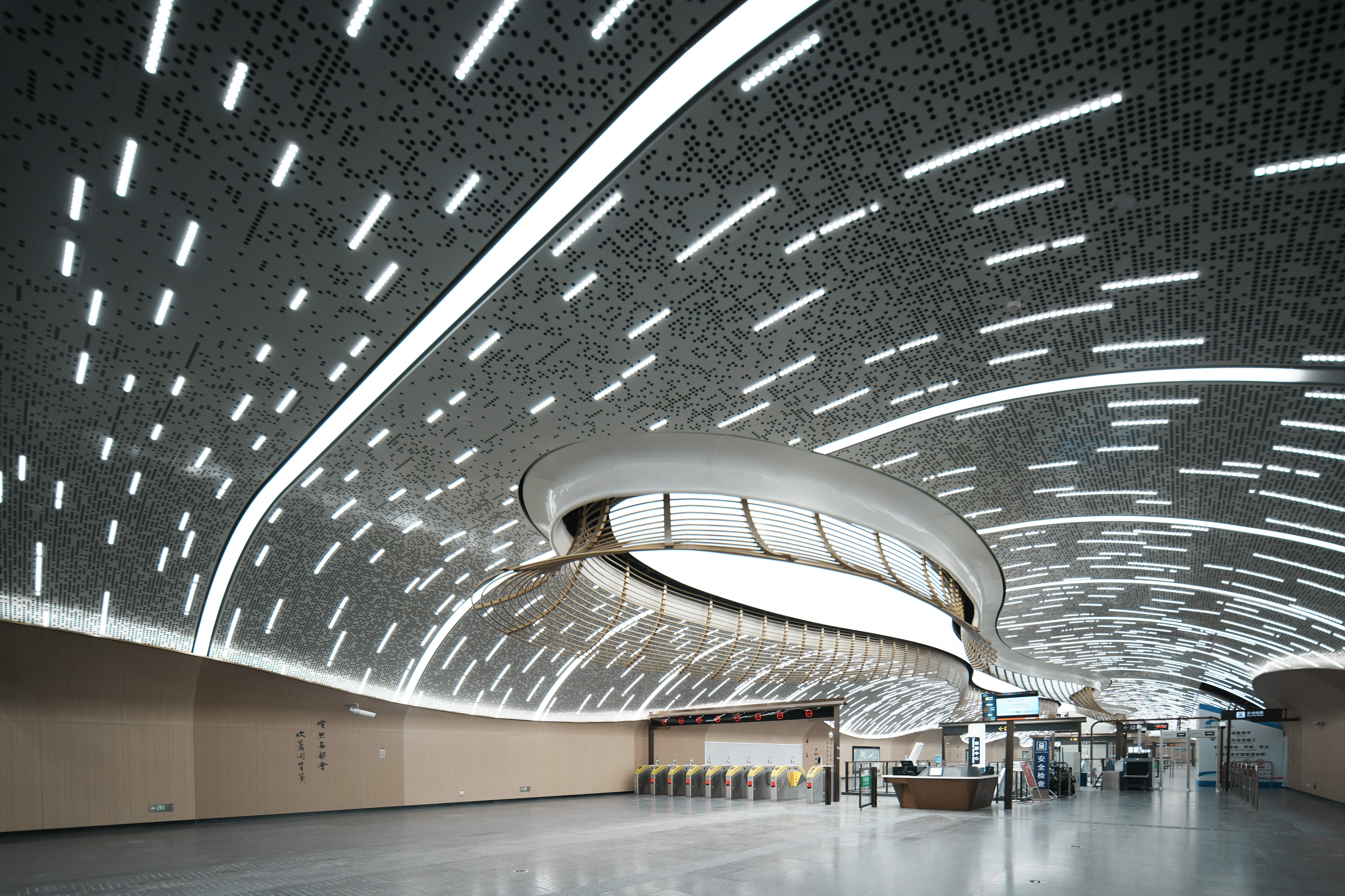 诗意场景的完美呈现,离不开智慧建造与前沿工艺的支撑。建设团队创新运用三维扫描与BIM技术等,构建1:1的高精度装修模型,实现了异形板材“毫米级”精准安装。杜甫草堂、华西坝、幸福梅林站创新采用“无柱式”设计,打造出大跨度的无柱弧形拱顶,在确保结构安全的同时,营造出站厅空间开阔通透的视觉震撼。“新南门站历经20余次灯光试验,调整300余个灯具点位,最终呈现出‘繁星叠影’的光影流转效果。”中铁城投成都轨道指挥部工作人员周维宝介绍,三官堂站则通过3D放样等技术,完成了近万片鱼鳞状灯具的精准排布,复现古蜀龙舟竞渡的磅礴场景。