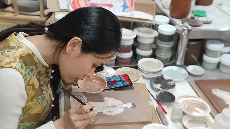 “谷建滔划赛艇时的肌肉线条得再劲一点,这是他拼出来的力量感!”她反复观看比赛视频,在未干的陶泥上快速调整细节。其泥绘技法以不同浓度陶泥堆叠层次,辅以矿物颜料晕染光泽,使画面兼具陶土的质朴与艺术的灵动。