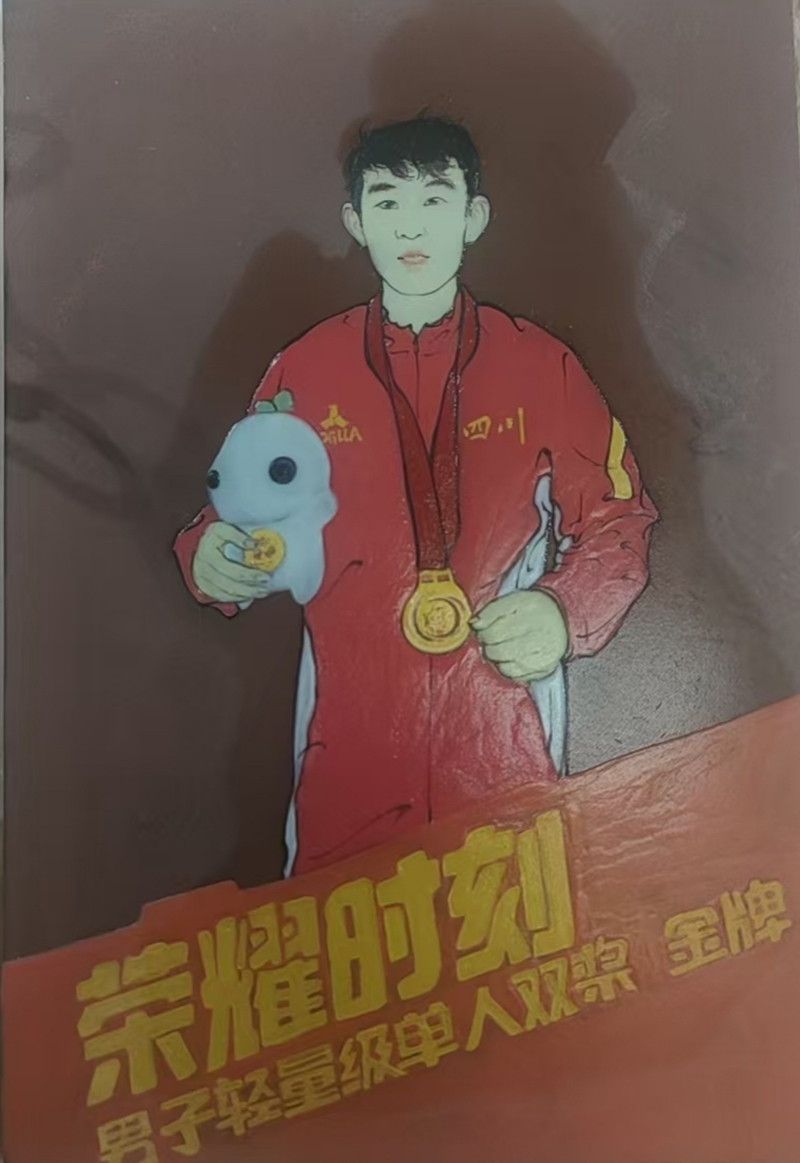 一天之内,两幅陶板画在她手中逐渐成型:一幅刻画谷建滔身着火焰纹运动服,驾“四川”号赛艇破浪前行,蓝色护目镜下眼神坚毅;另一幅描绘他手捧金牌、怀抱全运会吉祥物的荣耀时刻,红色队服上“四川”二字笔锋遒劲。“这是咱四川体育的底气!”丁玉蝶特意加重了那两个字的力道。