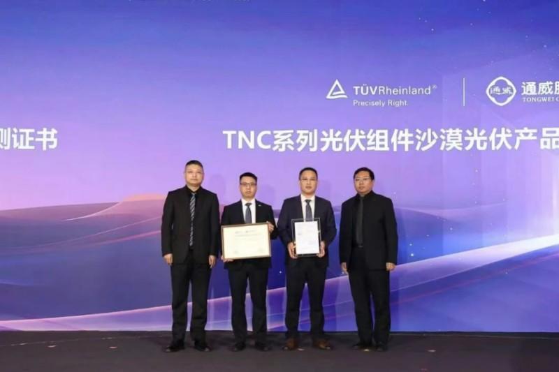 在颁证环节,通威TNC 3.0组件凭借出色的性能和质量,荣获TÜV北德 IEC61215 & IEC61730认证证书、TÜV南德抗阴影遮挡A级认证证书。同时,TNC系列组件还荣获CPVT沙戈荒场景耐候性“国品优选”检测证书、TÜV莱茵沙漠光伏认证证书。