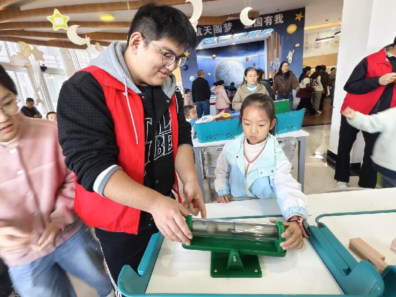 活动现场,从弹奏出奇妙乐章的“激光竖琴”,到让勾股定理豁然开朗的流动展示;从展现动态奇迹的“光栅动画”,到排起长队的血压、握力测试区……每一个展品前都围满了好奇的孩子。“为什么我的手碰到这个金属球,灯就亮了?”刚上三年级的小妤歪着头问志愿者。在得知“人体可以导电,你成了电路的一部分”的原理后,她立刻兴奋地招呼伙伴:“快来看,我会发电了!”