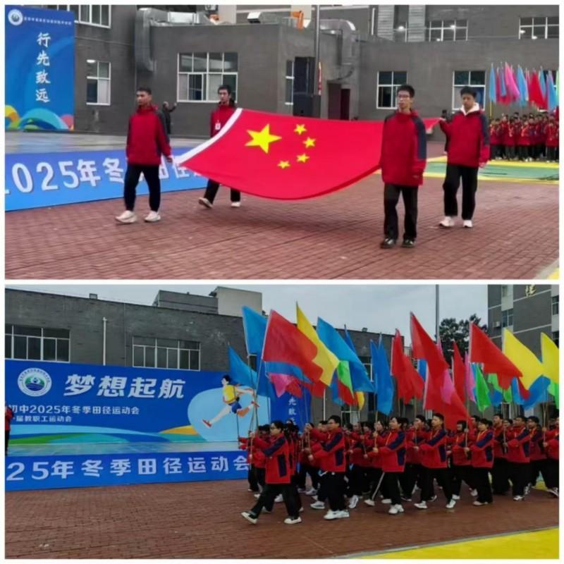 开幕式现场气氛热烈、秩序井然。激昂乐曲声中,国旗方队率先亮相,四名护旗手身姿挺拔、步伐坚定,全场师生肃立注目,现场氛围庄重肃穆;彩旗方队紧随其后,五彩旗帜在队员手中挥舞,尽显青春灵动。