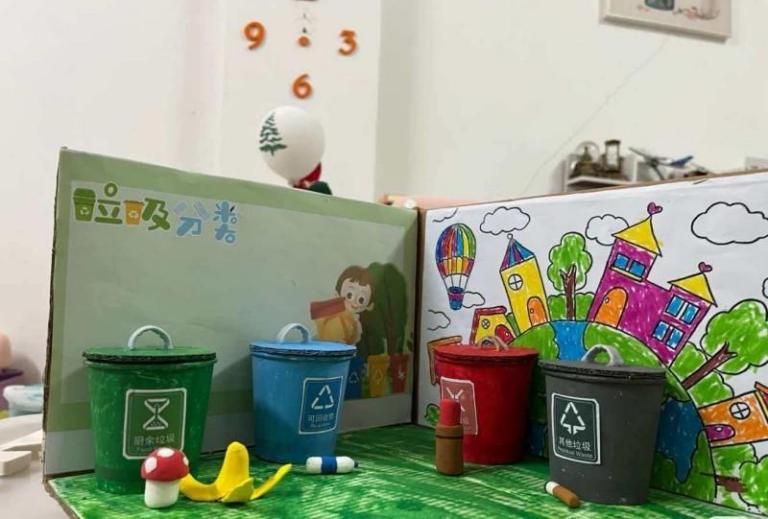 家长和孩子一同搜集废纸箱、塑料瓶等废旧材料,发挥创意制作玩教具。用废纸箱等材料制作的“垃圾分类站”、废旧马克笔制作的“机器人”等作品精彩纷呈,让孩子们直观感受到“变废为宝”的乐趣与意义。