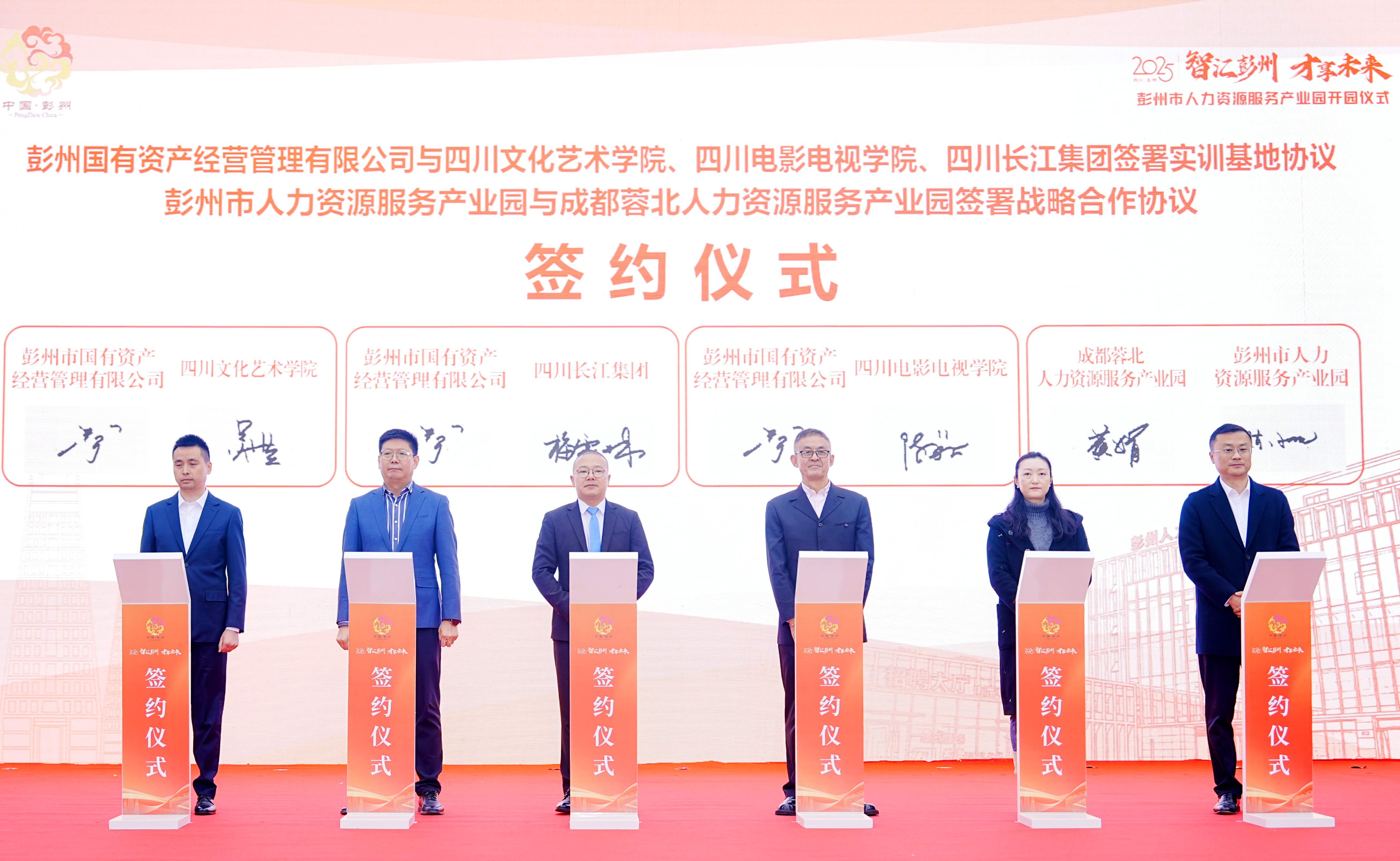 签约仪式上,彭州市人力资源社会保障局与成都大学签署人才培养及就业合作协议,围绕中医药等特色优势产业发展需求,以“中医药生活化、美学化”为特色发展理念,为“天府药市”建设和生物医药产业链完善提供人才支撑,也为彭州产业注入人文与创意活力;彭州市人力资源社会保障局与金牛区、青白江区、重庆长寿区及黑水县人社部门集中签署人力资源协作协议,共同推动人才共享与就业联动,服务区域中医药大健康产业发展;彭州市人力资源社会保障局与汇思人力集团、优蓝国际控股集团等行业领军企业签署合作协议,提升园区服务能级;彭州资管与四川文化艺术学院、四川电影电视学院等共建实训基地,携手构建产学研融合的人才生态。