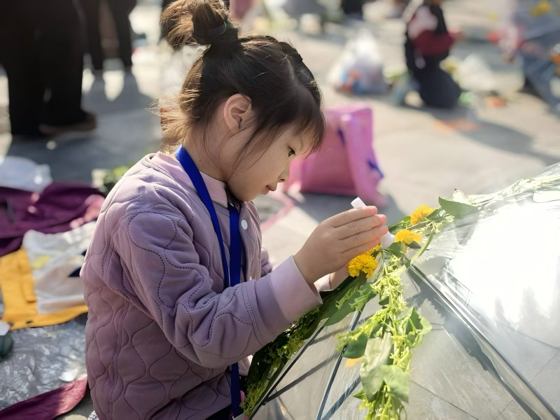 活动当日,孩子们在老师的带领下走进自然,兴致盎然地观察冬日景致,他们化身“小小艺术家”,通过“寻自然之美”——冬日漫步感知曲、“享音乐之美”——冬日草坪律动会、“创艺术之美”——冬日大地艺术创想、“美食美育”——冬日野餐品鉴会四个层层递进的环节,多感官、全身心地沉浸于冬日之美,将收集的落叶、枯枝、松果等自然材料拼贴、组合、拓印,创作出一幅幅充满童真趣味的艺术作品。