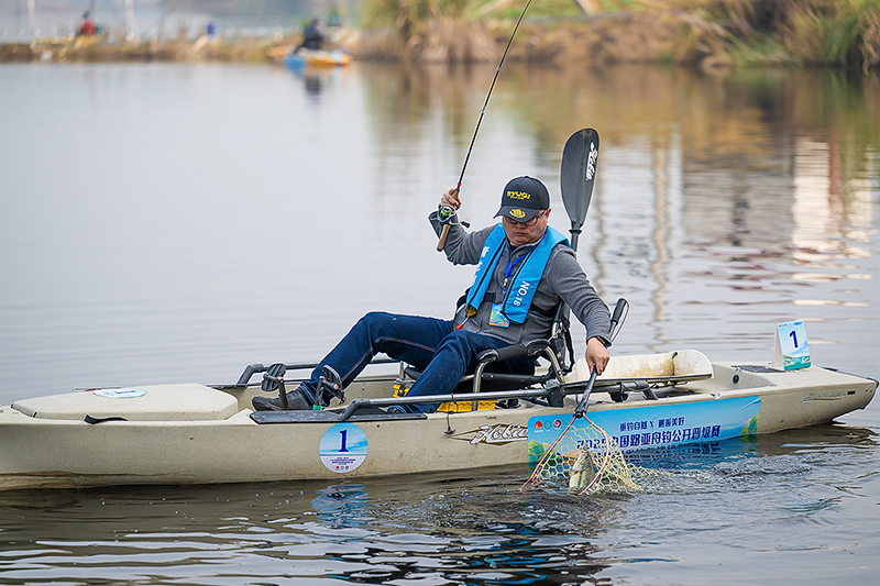 当天,路亚舟钓公开晋级赛和钓鱼锦标积分赛两个赛事同时开展。路亚舟钓公开晋级赛选手驾驶无动力卡亚克船在规定的区域内垂钓,鲈鱼、鲌鱼为有效鱼种,最终核算出所钓鱼的长度;锦标积分赛选手在规定区域使用4.5米手竿垂钓,最终评选出所钓鱼的总重量。比赛场上,选手们沉着冷静,挂饵、抛竿、起竿、取鱼,动作一气呵成,鱼竿来回抛出美丽的弧度,形成一条美丽的风景线。