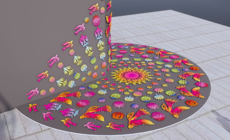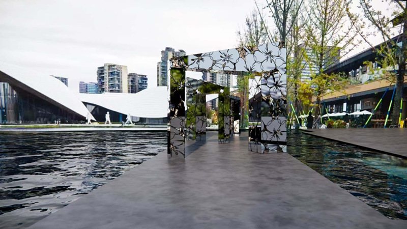 作品《眺望者的花屿》以镜面不锈钢与镂空芙蓉花纹,在临水空间探讨“观看”的双向性。芙蓉花朝开暮落,以其生命韧性象征成都的温情与包容。观者穿行其间,身份在“眺望者”与“被眺望者”间流动,最终使作品、场域与人共同构建出一个感知共生体,回应城市烟火中的人文精神。