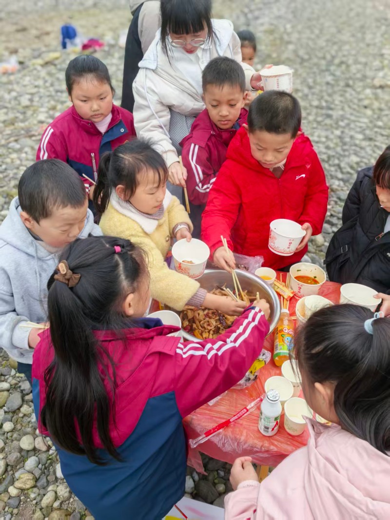 上午8:30,老师对同学们集中进行野外活动安全教育后,大家带着锅碗瓢盆、柴米油盐、果蔬肉类等兴高采烈地的向杨村河畔筒车坝进发。到达目的地后,各班分工协作,有的垒灶、有的淘米洗菜、有的捡柴烧火、有的洗肉穿烤串,忙的不亦乐乎。远处近处炊烟袅袅、身影忙忙碌碌,不时传来同学们兴奋的大呼小叫声。开饭了,个个吃得津津有味,同学们你到我这里尝一口,我到你那里夹一筷,甜蜜地分享着自己的劳动成果。午饭后,老师还组织同学们开展了丰富的娱乐活动。
