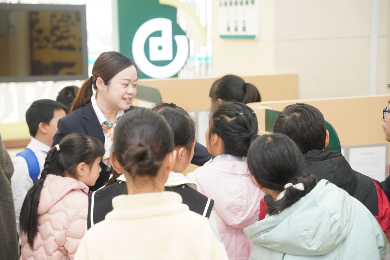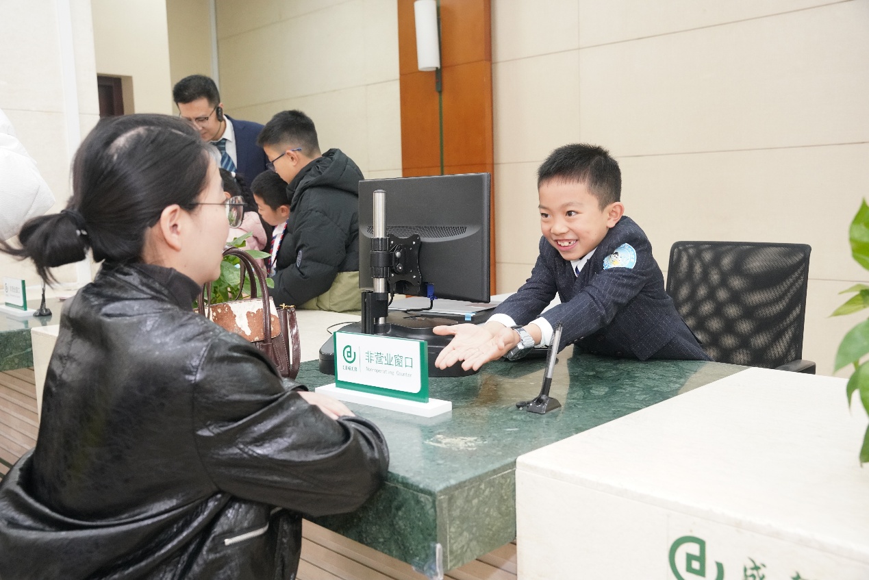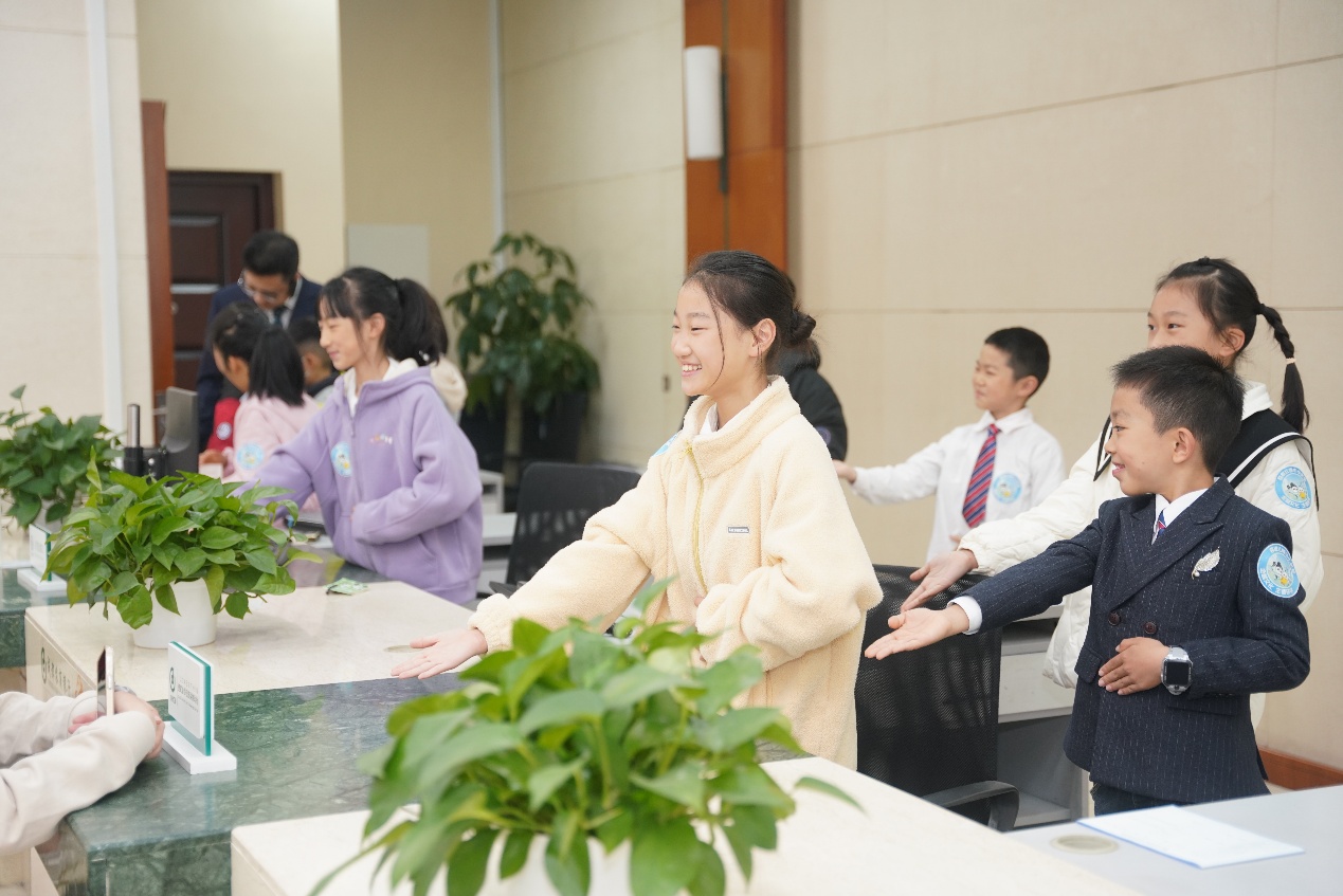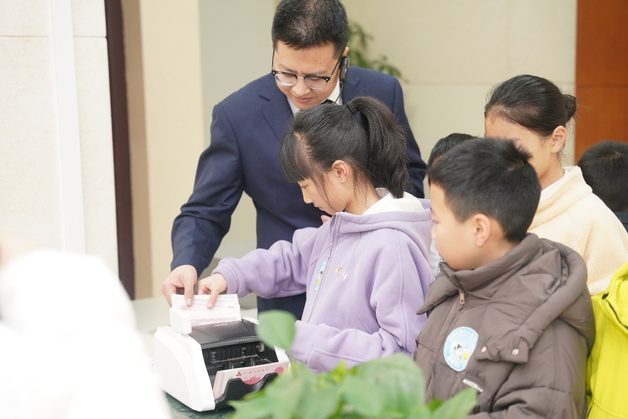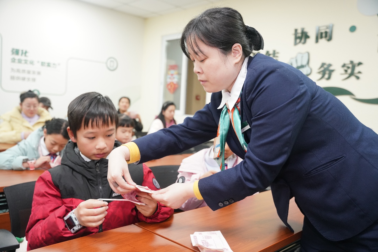 “您好,请问您要办理什么业务?”“这是您的存单,请收好!”存取款业务刚体验完,“小史官”佩戴上专属领花、领结,化身“小小银行柜员”,亲身参与存取款业务体验。从接过“客户”的现金、核对金额,到双手递还,每一个步骤都做得有模有样。