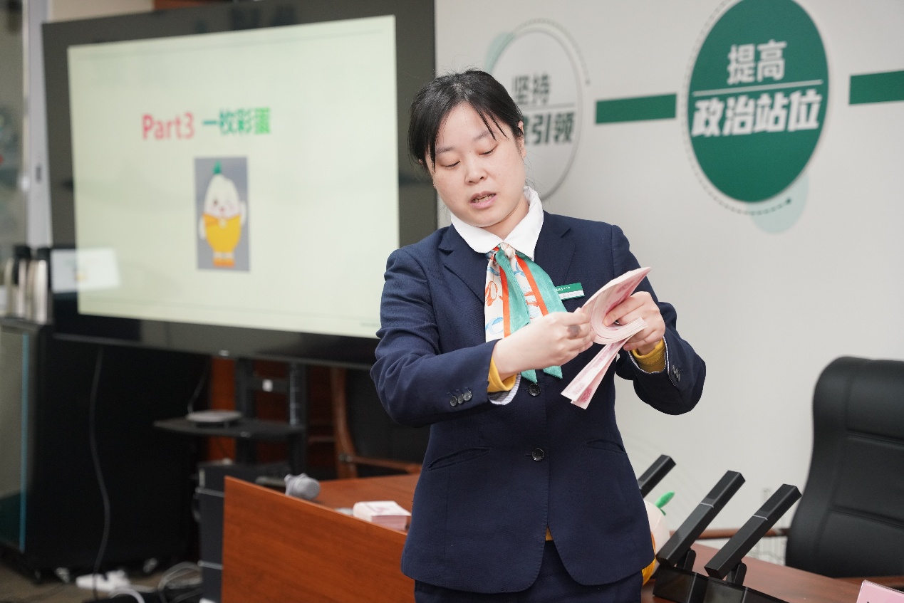 紧接着,一场令人屏息的“花式点钞”表演,瞬间将微课堂的热闹氛围推向了最高潮。工作人员身着整齐制服,手持一叠崭新的练功券走到台前,“单指单张”“多指多张”“扇面点钞”……整个过程行云流水,一场指尖上的“魔术”让孩子们看得目不转睛。