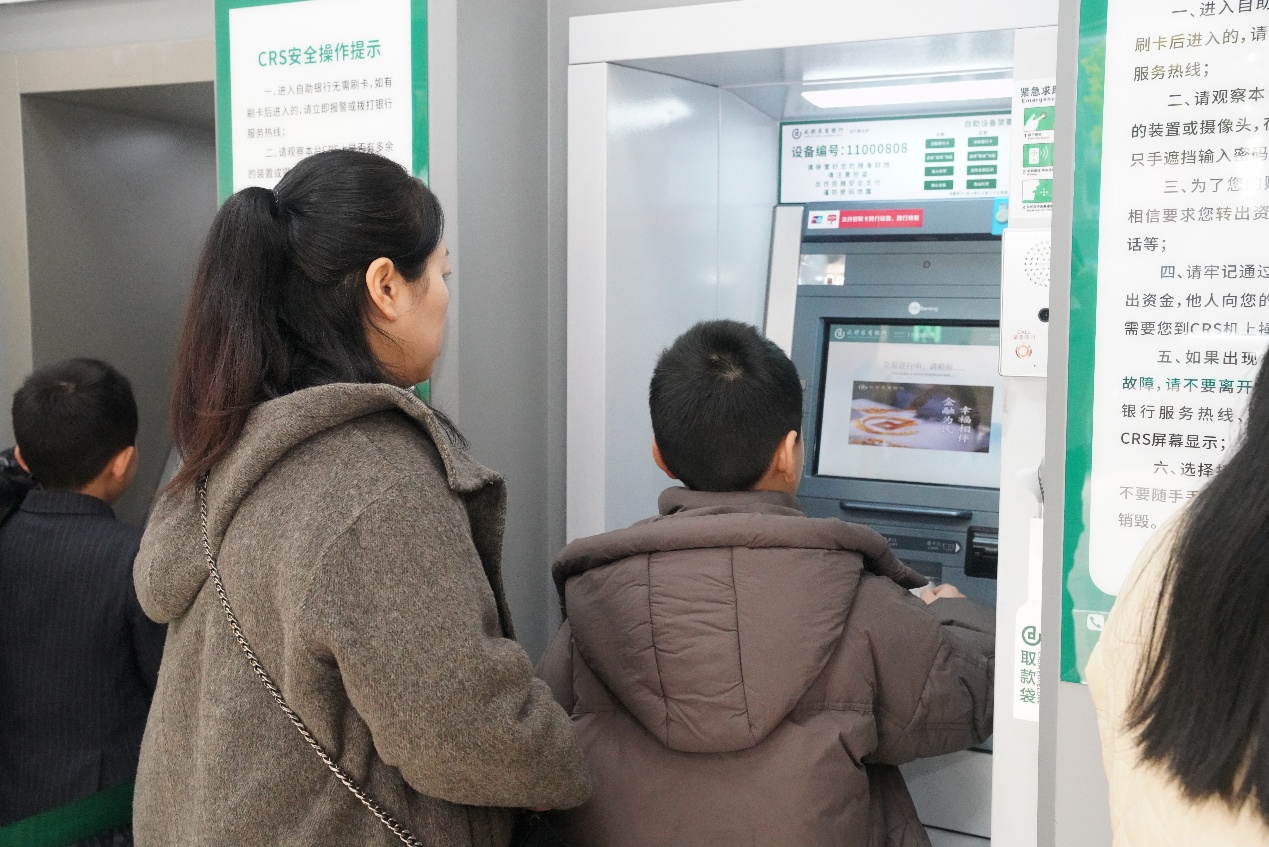 在成都农商银行总行营业大厅,工作人员带领“小史官”们逐一识别银行大厅的功能分区,详细讲解各个区域的功能。在银行工作人员的指导下,“小史官”开启充满好奇的 ATM机实操体验。工作人员指着ATM机上的插卡口、密码键盘、出钞口和凭条出口,耐心讲解“每个部位的小作用”,还特别提醒“密码是银行卡的‘小秘密’,输的时候要记得用手轻轻挡住键盘哦”。