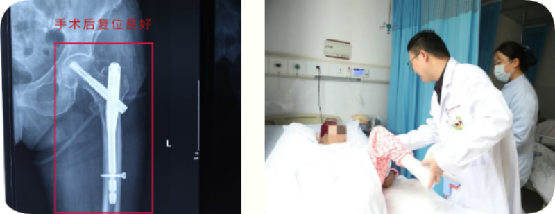 手术当日,骨伤科团队采用微创闭合复位PFNA(股骨近端防旋髓内钉)内固定术。在C型臂X光机实时引导下,仅通过两个不足3厘米的小切口,便完成了骨折碎片的精准复位与内固定植入,整个手术耗时不足1小时,术中出血量控制在50毫升以内,最大限度减少了对老人身体的创伤。“老年患者手术,‘微创’不仅是技术要求,更是对身体机能的保护,每一步操作都要精准到毫米。”手术主刀医师、骨伤科主任王勇介绍。