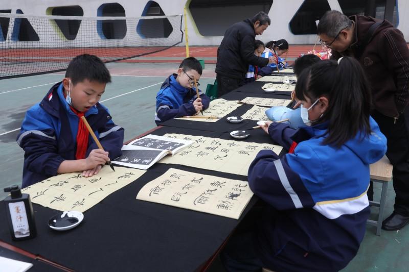 在紧邻的蓝晒展区,一幅幅蓝白相间的作品静静陈列,深邃的蓝色与纯净的白色交织出奇幻的图案,蕴藏着孩子们对自然与艺术的无限猜想;扎染展台前,一张张布满独特花纹的方巾错落摆放,每一件都是独一无二的艺术作品;书法展前,孩子们稚嫩却工整的笔墨,尽显对传统文脉的懵懂理解与由衷热爱……