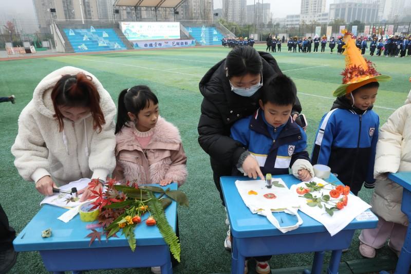在亲子植物拓染活动区,家长与孩子们围坐一起,将花瓣、树叶固定在帆布包上,小锤子轻轻捶打间,草木的脉络与色彩便晕染开来。“你看,这是我和爸爸一起做的拓染包,上面的小花多好看!”“我的包上有枫叶,是我特意挑选的。”完成创作后,孩子们举着自己的作品,兴奋地向同学分享创作的喜悦,一张张笑脸与色彩斑斓的拓染包相映成趣。