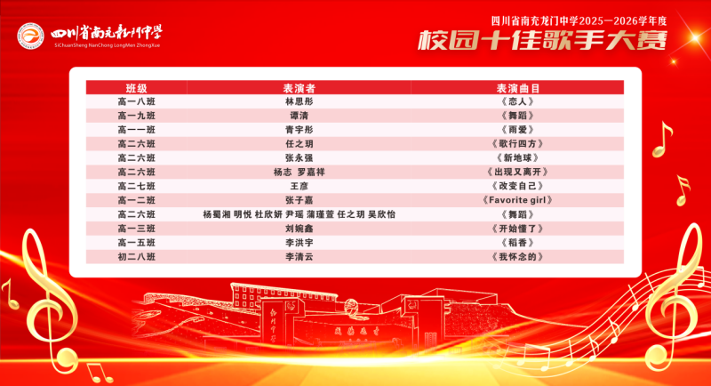 “唱响青春主旋律”校园歌手大赛吸引了众多热爱音乐的学生踊跃参与。他们用清澈的嗓音、饱满的情感,演绎了一首首脍炙人口的经典红歌和青春励志曲目。比赛不仅展现了龙中学子多才多艺、全面发展的风采,更生动诠释了爱国、奋斗与梦想,进一步营造了健康向上、格调高雅的校园文化氛围。