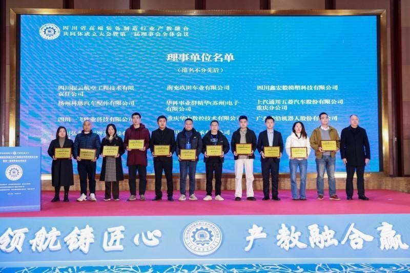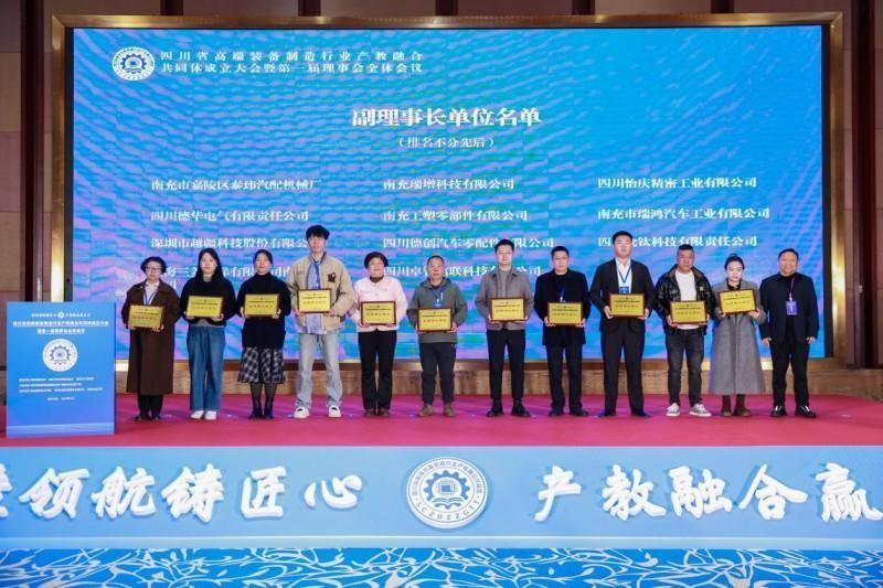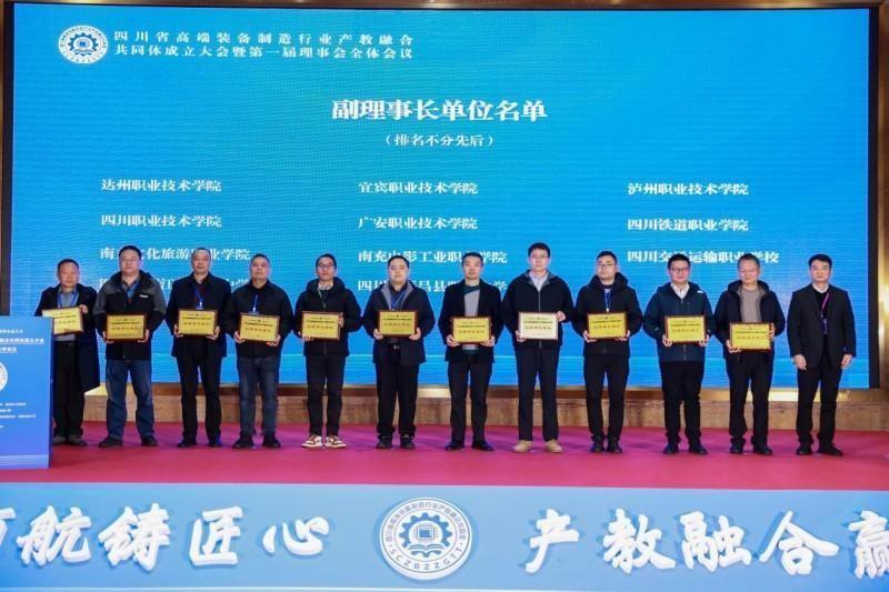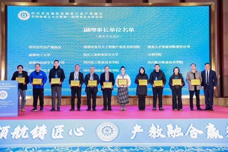 在全场嘉宾的共同见证下,岳剑、熊庄、黎明、王兴东、覃鸿飞、杨育林、苟国旗共同为“四川省高端装备制造行业产教融合共同体”揭牌。出席会议的领导、嘉宾为理事长单位、常务副理事长单位、副理事长单位、理事单位授牌。