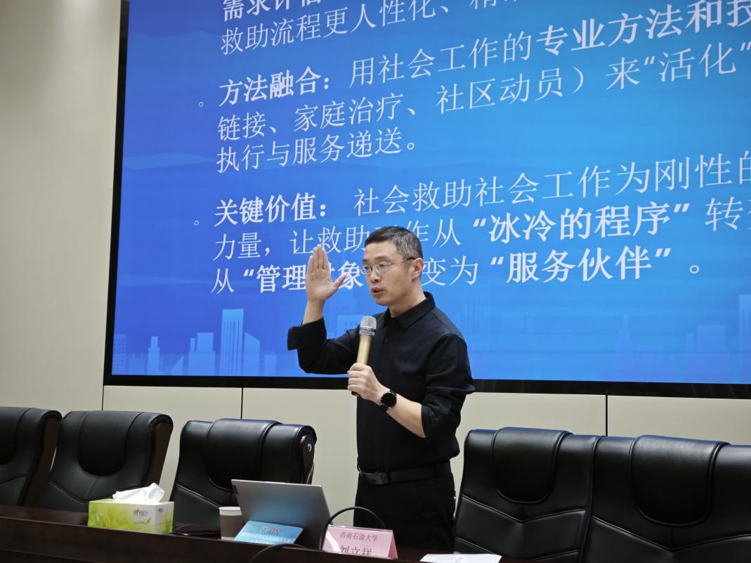 下午专题:西南石油大学法学院副教授、硕士生导师刘立祥带来了《社会救助社会工作概论与实务前沿》的精彩授课。课程系统阐释了社会救助与社会工作的专业融合逻辑,深入剖析了需求评估者、资源链接者、能力建设者与政策倡导者四大核心角色功能,并结合真实案例解析了社会正义、尊重接纳、自决赋能等专业伦理在实务中的困境与应对。同时,课程从个案管理、小组工作与社区介入三个层面讲解了精准评估与分层干预的方法体系,并围绕“发展型救助”“智慧救助”等前沿趋势,探讨了数字化技术在主动发现、精准服务中的实践路径与人文边界。授课内容兼具理论高度与实操价值,为学员构建了系统化的专业知识框架。
