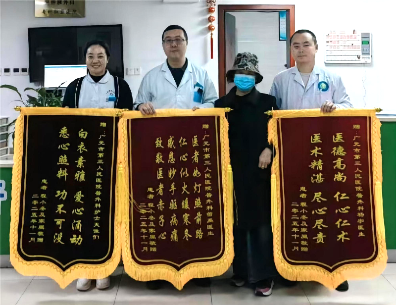 12月5日,广元市第三人民医院普通外科上演温暖一幕:61岁的程女士在家属陪同下,手持三面鲜红的锦旗,专程前来感谢副主任医师曾禹、主治医师杨宇及护理团队。