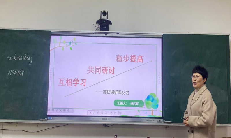 图为张沐珍老师正在英语课听课反馈专题汇报