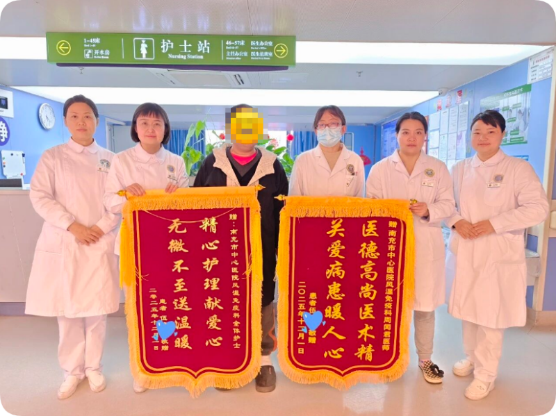 “谢谢你们,让我重新站起来了!”近日,在首都医科大学附属北京安贞医院南充医院·南充市中心医院(简称“北京安贞医院南充医院”)风湿免疫科走廊里,患者伍大叔声音哽咽、双手颤抖地将两面鲜红的锦旗递到杨婧、周闻君医生和护士们手中。
