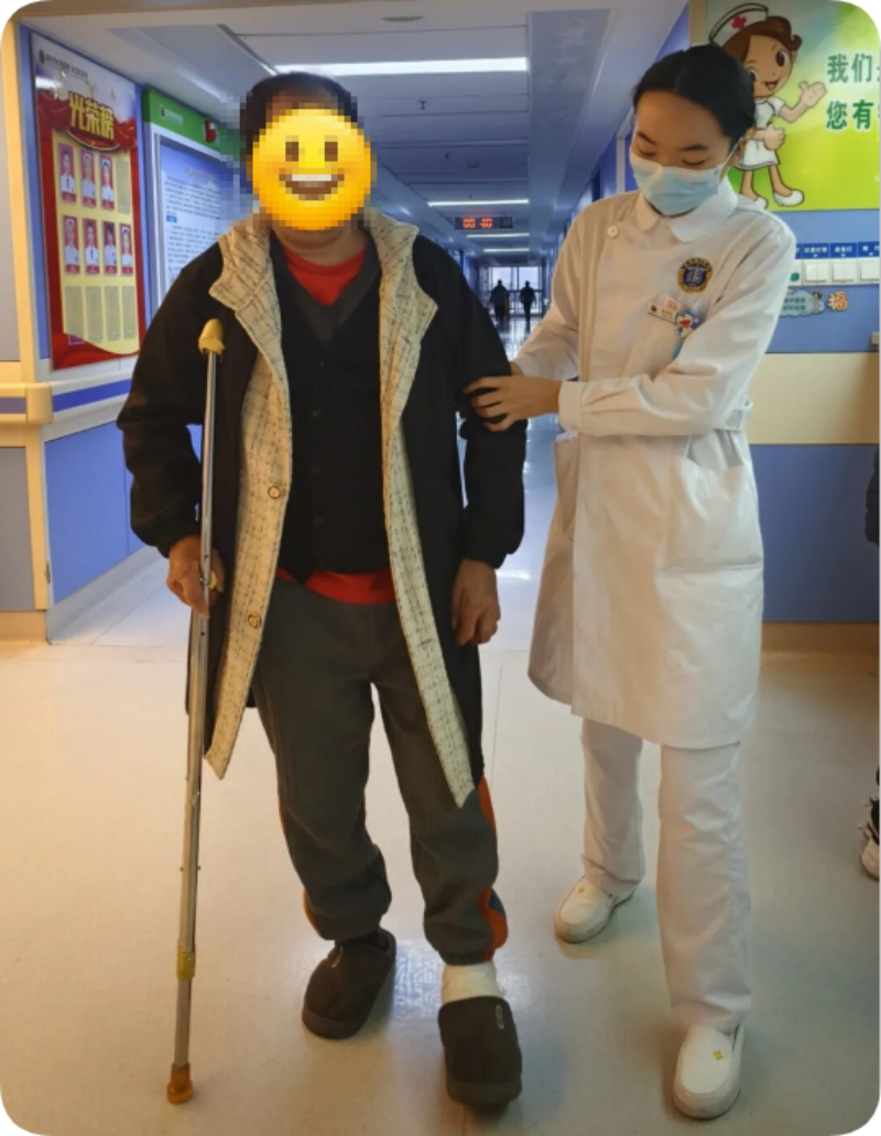 近两个月的朝夕相处,医护团队成了伍大叔最亲的人。护士们不仅从每天蹲在床边为他处理恶臭的伤口,还轮流帮他买饭、打水、擦身;康复训练时,医生护士手把手扶着他,从坐起、站立到扶拐迈步。一遍遍的鼓励让原本沉默寡言的伍大叔,慢慢开始跟医护人员唠家常,脸上也重新有了笑容。“我以为这辈子再也站不起来了,是你们给了我第二次生命!”当第一次扶着拐杖走出病房时,伍大叔眼里闪着泪光。