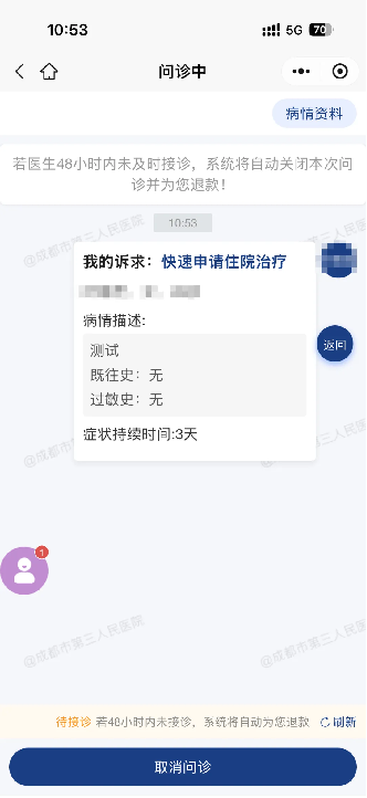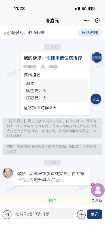 家住外地的刘阿姨(化名)长年受心血管疾病困扰无法解决,在获知成都市第三人民医院开通“复杂疑难心血管病精准诊疗快速通道”后,通过互联网医院小程序提交了申请。申请提交当天,心血管内科团队主动与其联系,发现刘阿姨符合条件,不仅制定初步诊疗方案,还协助开具入院证、预留床位,实现了“极速就诊”。