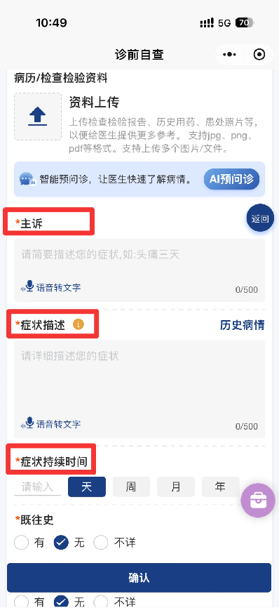 2.提交材料:阅读问诊需要之后,按要求填写患者基本信息,同步上传病历资料、检查检验报告、主诉、症状描述及症状持续时间等申请材料,完成线上提交;