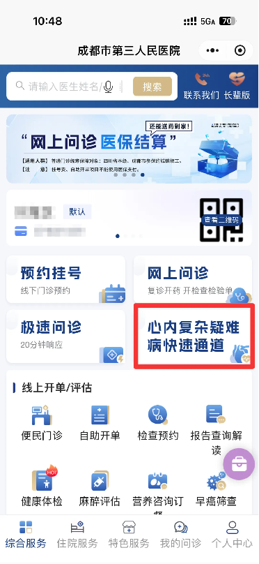1.选择通道:关注“成都市第三人民医院服务号”,进入成都市第三人民医院互联网医院后,点击“心内复杂疑难病快速通道”,根据自身情况选择对应通道类型;