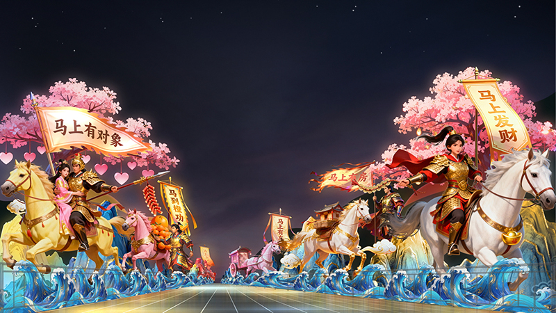 高35米、以中国结为创意的“华结映门”灯组,首次实现正背面视觉统一,宛如连接古今的时空之门;萃取《庄子》鲲鹏宏大意象的巨型灯组“神奇华夏”,长约210米,通过神话叙事,展现强国风貌与民族豪情;高22米的“年年招财”年兽灯组,搭载最新AI交互系统,实现远古瑞兽与人类的亲切“对话”;在农历马年来临之际,以《木兰从军》为蓝本打造的180米长“木兰传奇”灯组,让姿态各异的骏马造型与木兰的飒爽英姿相得益彰,传递出深沉的家国情怀。