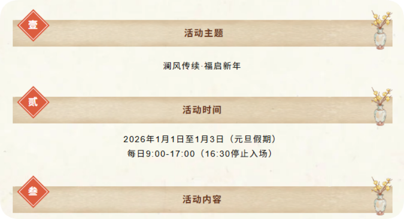 2026年的钟声即将敲响,为迎接元旦佳节、辞旧迎新,张澜纪念馆精心策划了“澜风传续,福启新年”主题系列活动。旨在通过沉浸式互动体验及文化宣讲等形式,邀请广大公众齐聚一堂,在欢庆新年到来的同时,感悟红色文化魅力,传承先贤精神,以崭新姿态开启新一年的文化探索之旅。