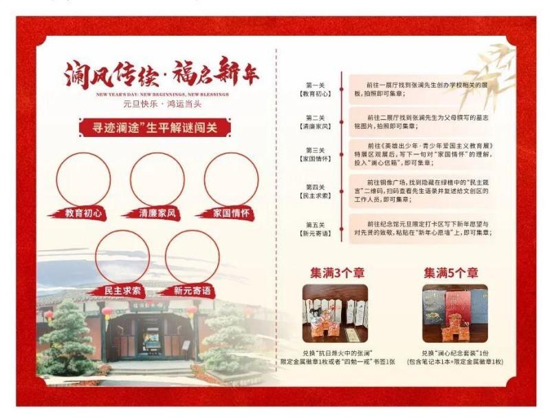 第一关【教育初心】:前往一展厅找到张澜先生创办学校相关的展板,拍照即可集章;第二关【清廉家风】:前往二展厅找到张澜先生为父母撰写的墓志铭图片,拍照即可集章;第三关【家国情怀】:前往《英雄出少年·青少年爱国主义教育展》特展区观展后,写下一句对“家国情怀”的理解,投入“澜心信箱”,即可集章;第四关【民主求索】:前往铜像广场,找到隐藏在绿植中的“民主箴言”二维码,扫码查看先生语录并复述给文创区的工作人员,即可集章;第五关【新元寄语】:前往纪念馆元旦限定打卡区写下新年愿望与对先贤的致敬,张贴在“新年心愿墙”上,即可集章。