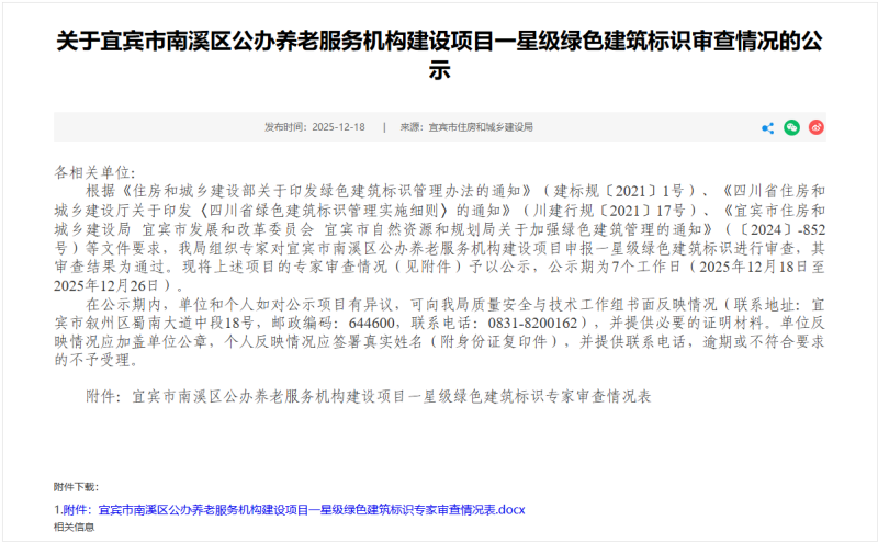 宜宾市南溪区公办养老服务机构建设项目获评一星级绿色建筑标识