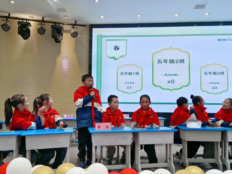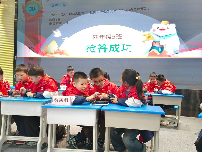 一、二年级萌娃率先登场。必答题聚焦教材生字与书目核心,孩子们凝神思索、快速作答,小脸满是专注;抢答题涵盖组词、古文字对应、图片猜诗,小萌娃们在欢乐竞技中夯实知识,清脆应答与阵阵欢笑尽显童真,以热忱品汉字之美,用灵动展诗词之趣。三、四年级学子接续登场。必答环节各位选手凝神聚力,借答题设备从容应答诗词知识,30秒限时尽显扎实功底,字字皆是日积月累;抢答环节氛围热烈,小选手们反应敏捷、争相作答;飞花令你来我往,欢呼与惋惜交织,比拼扣人心弦,尽显少年朝气与诗词积淀。五六年级的同学们压轴登场,上演巅峰对决。必答抢答从容应对、沉稳自如,深厚诗词积淀令人赞叹;飞花令对决中,“春”“花”“秋”“月”等意象轮番登场,他们引经据典,从唐诗宋词到元曲小令,信手拈来、妙语连珠。尽显少年才情与文化底蕴。
