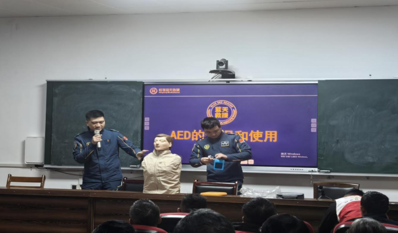 “同学醒醒,同学醒醒,你能听到我说话吗?”在AED(自动体外除颤器)的认识与使用及心肺复苏术讲解环节,蓝天救援队队员采用“理论+实操”的模式,通过图文演示介绍AED的工作原理、适用场景及操作流程。同时再利用模拟假人进行心肺复苏术的标准化示范,对胸外按压的位置、深度、频率,人工呼吸的操作规范等关键要点进行细致指导。