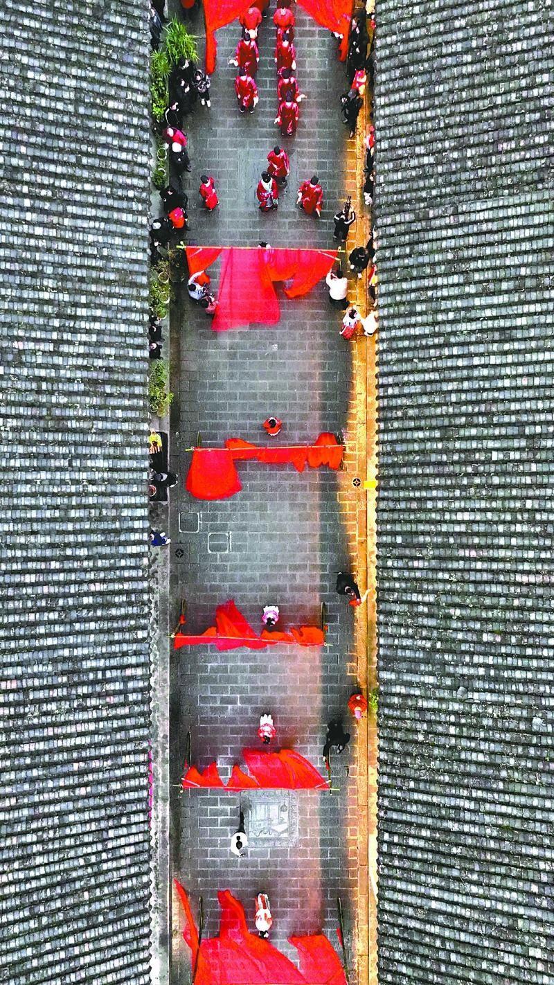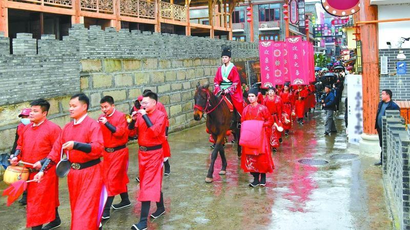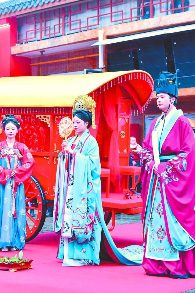 当天下午,展演活动持续升温,围绕亲迎、成礼、青庐之礼三大环节,集中展示了下婿礼、催妆、撒谷豆、望镜、展拜等18项传统婚俗。展演队伍沿红线里婚恋艺术街区和新政老街巡游,让更多市民游客近距离感受传统婚俗的独特魅力。新政老街经改造后于元旦正式开街,成为这场主题婚恋活动的绝佳展示载体。