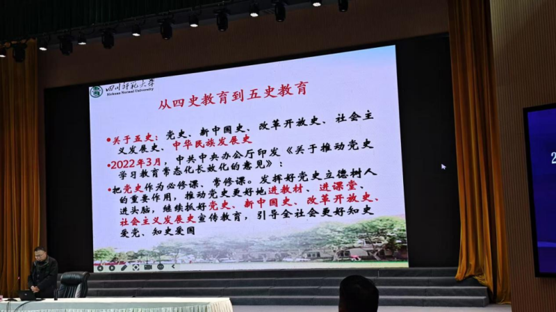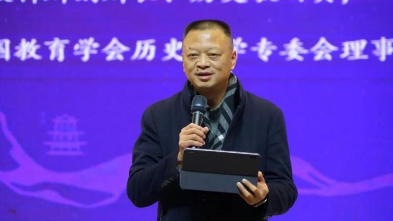 教育部基础教育课程教材专家工作委员会委员,中国教育学会历史教学专委会副主任,四川省教育学会历史教学专业委员会理事长陈辉教授以《2025年历史课标修订与五史教育策略》为题,系统梳理了从“四史”到“五史”的演进脉络。陈教授指出,“五史”相互关联、不可分割,历史教学旨在通过系统阐述中华民族“多元一体”的形成、近代以来的抗争奋斗与走向复兴的历程,构筑学生的历史认同,强化民族复兴的使命自觉,坚定走中国特色社会主义道路的信念。