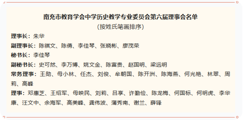 南充市教育学会中学历史教学专业委员会的成立,旨在更好地服务于立德树人这一根本任务,致力于推动全市中学历史教学的改革与发展,探索学科核心素养的有效落地路径。更重要的是,它为全市广大历史教育工作者搭建了专业平台,便于大家在此交流思想、切磋教学、分享成果,共同推动南充中学历史教育高质量发展。