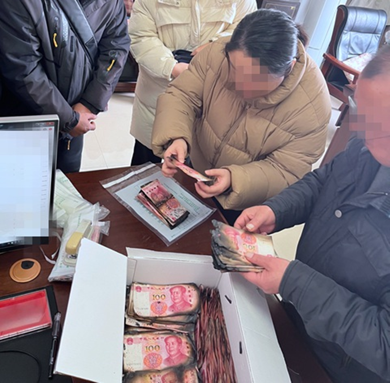 据悉,当日该客户神色焦虑地携带一盒子受损现金前往工行德阳分行网点求助。原来客户家中此前意外失火,存放的现金被火灼烧后又遭水泡,大部分纸币边缘焦黑碳化、票面粘连破损,部分甚至仅剩半张,这些现金还是家中老人的积蓄,让客户焦急万分。“看着被烧得面目全非的钱,我心都凉了。”客户回忆时仍难掩激动,抱着一丝希望来到工行网点求助。