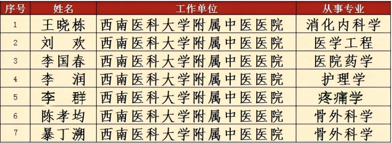 西南医科大学附属中医医院王晓栋(消化内科学)、刘欢(医学工程)、李国春(医院药学)、李润(护理学)、李群(疼痛学)、陈孝均(骨外科学)、暴丁溯(骨外科学)7名专家凭借深厚的专业积淀与突出的业务能力成功入选。