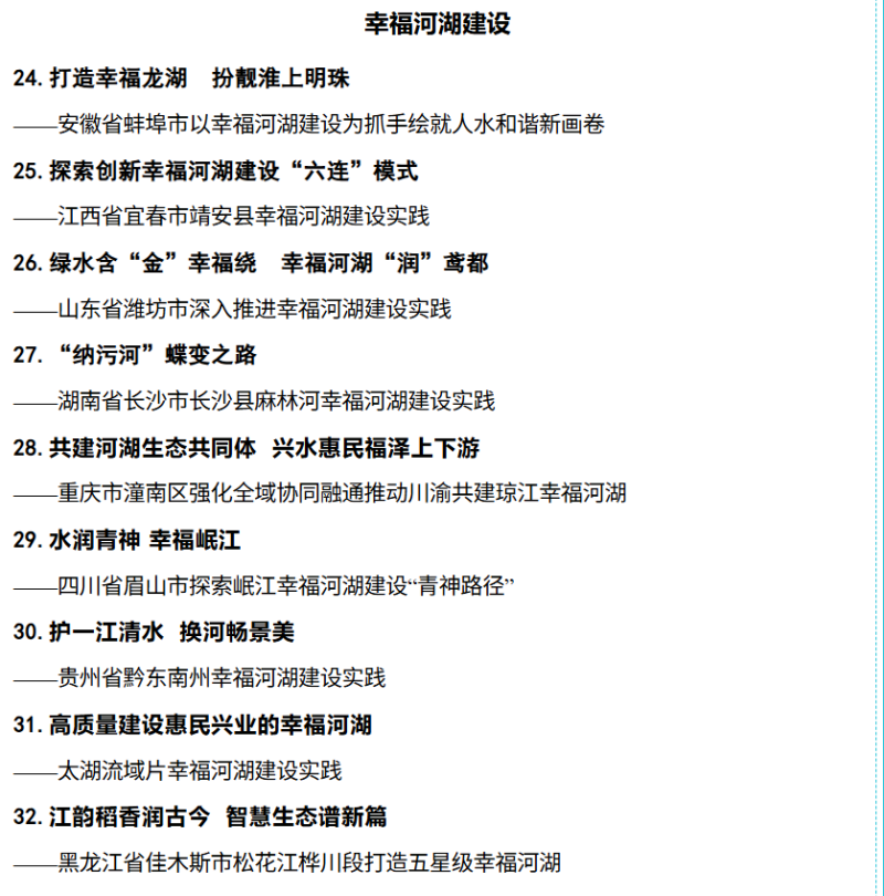 2025年,在水利部河长办指导下,水利部发展研究中心组织开展了第六次全国范围内全面推行河湖长制典型案例征集、遴选与编撰工作*,组织专家从各省(自治区、直辖市)及流域管理机构报送的案例中甄别、精选出59篇典型案例,四川省眉山市成功入选幸福河湖建设案例。