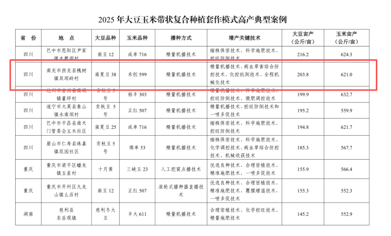 近日,全国农业技术推广服务中心发布2025年72个大豆大面积高产典型。其中,四川南充市西充县大豆玉米带状复合种植套作模式成功入选,位列全国第2。在该套作模式下,大豆亩产达到203.8公斤。(供稿方:南充市农业农村局)