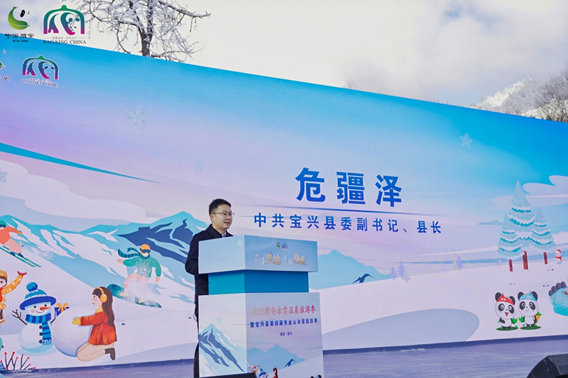 宝兴县委副书记、县长危疆泽在致辞中表示,宝兴是熊猫老家,是世界第一只大熊猫科学发现地和模式标本产地,81.7%的幅员面积纳入大熊猫国家公园范围。同时宝兴还是红色热土,境内的夹金山是红军长征翻越的第一座大雪山,是“长征国家文化公园”雪山草地的起点。冰雪是大自然馈赠的宝贵资源,冬天的宝兴更是银装素裹,神木垒、夹金山等景区被白雪覆盖,玉树琼枝,冰雕玉砌,宛如童话世界。本届冰雪旅游季,宝兴县推出了“冰雪+旅游”“冰雪+体育”“冰雪+文化”“冰雪+美食”等一系列丰富多彩的活动。这既是一场展现宝兴冰雪魅力的文旅盛会,也是一扇全面展示宝兴自然风光、民俗风情、发展成果的精彩窗口。