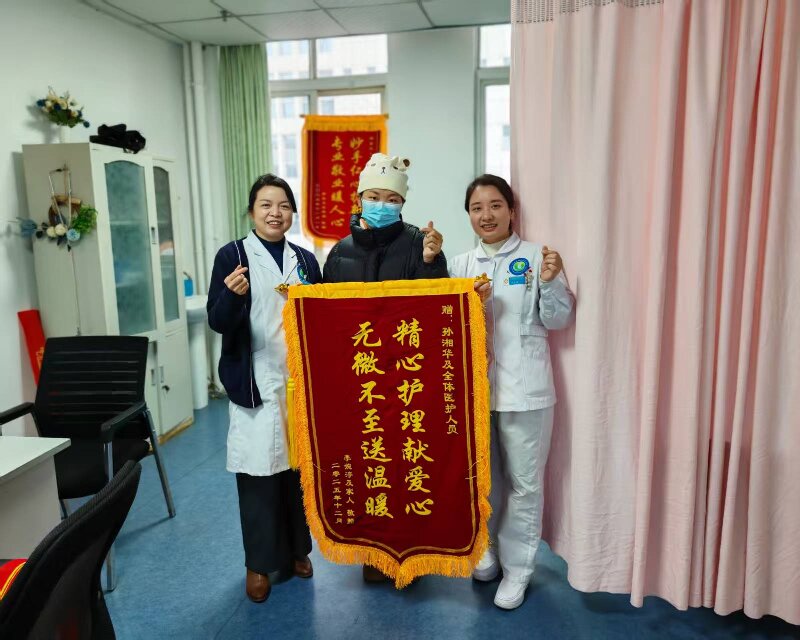 上午10点,产后复查的李女士将一面鲜红的锦旗送至产科主任孙湘华手中,上书:“医者仁心尽心尽责,护士有爱堪比南丁”,锦旗上字字铿锵,道尽对医护团队科学管理的感激。产妇李女士因妊娠期高血压合并子痫前期,孕36+周入院保胎治疗。产科团队通过动态血压监测、个性化用药方案及营养指导,成功控制病情,并于孕37周+1天行剖宫产术终止妊娠,母婴平安。