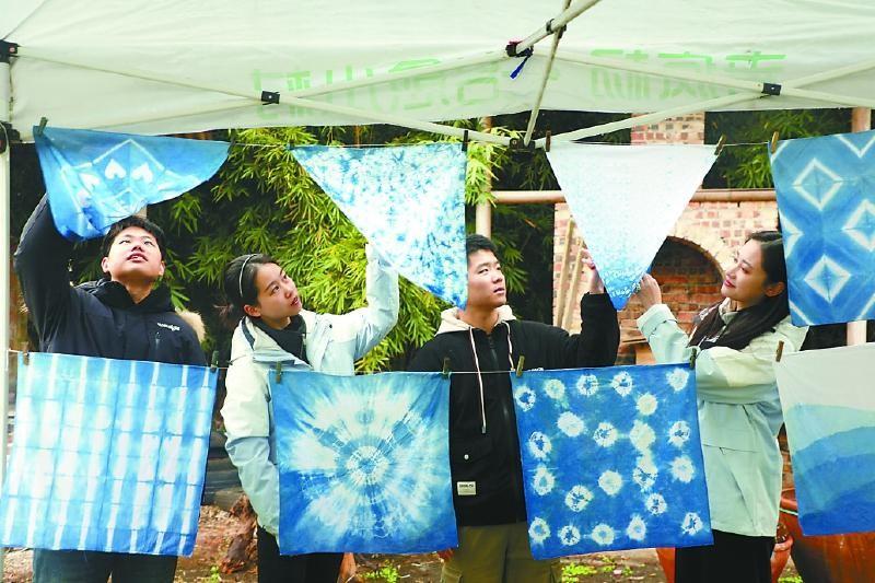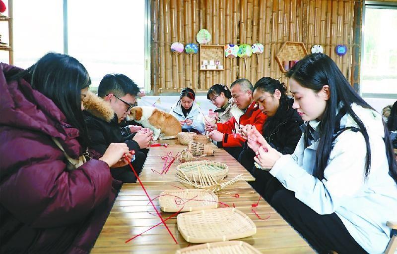 在“手艺传情·童心绘梦”体验区,热闹中弥漫着浓郁的文艺气息。在“对联送福”现场,本地书法家们挥毫泼墨,一副副洋溢着新春祝福的春联、一个个遒劲有力的“福”字,免费送到村民和游客手中;蓝染工坊里,老疯杨团队手把手教授植物染技艺,游客们亲手制作蓝染方巾、福字挂饰,感受传统技艺的魅力;竹编课堂上,在老师傅的耐心指导下,游客们尝试编织灯笼、新春挂饰,指尖翻飞间,传统手艺焕发生机。“童趣天地·乡村记忆”区域更是热闹,滚铁环、抽陀螺、丢沙包等游戏,让大人们重温童年时光,也让孩子们感受到不一样的童趣。