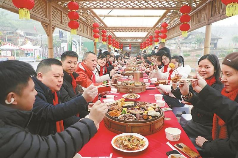 “蒸蒸日上,富得流油,‘充国长桌宴’开席咯!”中午时分,随着一声响亮的吆喝声和铿锵的锣鼓声,“味觉乡愁”长桌蒸笼宴正式开席。百米长桌沿场地一字排开,来自五湖四海的游客与当地村民围坐一堂,一屉屉热气腾腾的蒸笼陆续上桌。掀开笼屉,扣肉、粉蒸肉等西充特色蒸菜香气四溢,食客们举杯同庆,互道新年祝福。推杯换盏间,浓浓的团圆意与乡愁味,在每个人的心间流淌。“这不仅是一顿饭,更是一场情感的联结,是记忆里最温暖的年味。”一位返乡过节的西充游子动情地说。