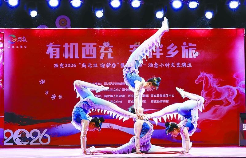 “刚熏好的腊肉,香得很哟!”一阵叫卖声传来,空气中交织着腊味的咸香。在“寻味西充·年味天兴”乡村年货市集,设置了非遗展销区、农特产品区、文创体验区、民俗表演区和未文剧场五大区域。本地手工艺品、西充腊味、手工苕粉、有机农产品等特色产品琳琅满目,吸引游客驻足选购。民俗表演区的快闪节目轮番上演,演员们的精彩演绎赢得观众阵阵喝彩。未文剧场内,脱口秀的幽默段子、萌宠的憨态表演,让现场笑声不断。