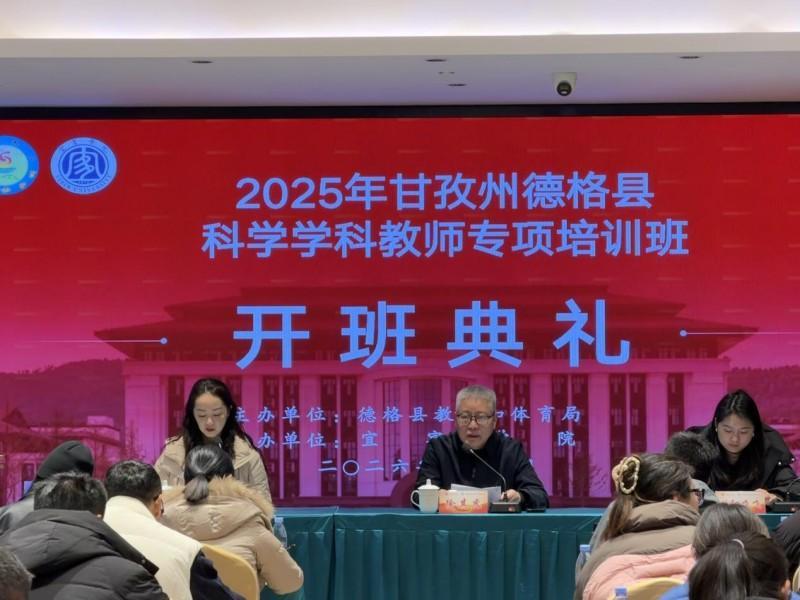 1月5日上午,由德格县教育和体育局主办、宜宾学院承办的2025年德格县科学学科教师专项培训开班典礼在成都市高新区维也纳酒店会议报告厅举行。德格县教育和体育局党组成员、县人民政府督学欧阳飞飞,宜宾学院党委副书记、纪委书记徐其虎及特邀专家出席,与全体参训教师齐聚一堂,共同开启为期7天的专业研修之旅。