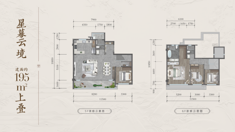 建面约195㎡的上叠产品,将生活向往引向高处。得益于地块7-12米的天然坡地高差,叠拼建筑的整体标高得以自然抬升,这意味着即便是6层的叠拼,其视野高度已相当于常规建筑的9层以上。该户型不仅享有顶层空间的静谧与私密,更拥有一个尺度可观的露台或屋顶花园。这可以是家庭独享的观景台,也可化作星空会客厅、孩童的游乐场或主人的冥想角落,契合了那些向往开阔视野、珍视安静与边界感,追求浪漫诗意的家庭。