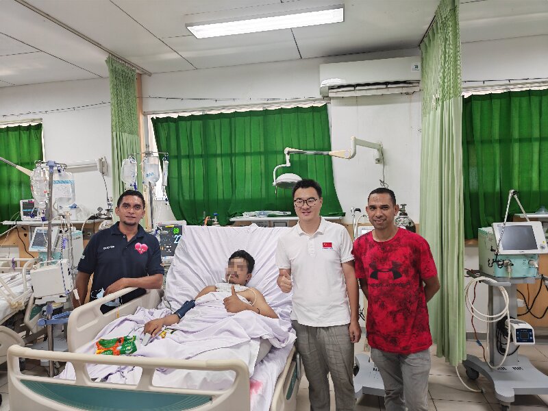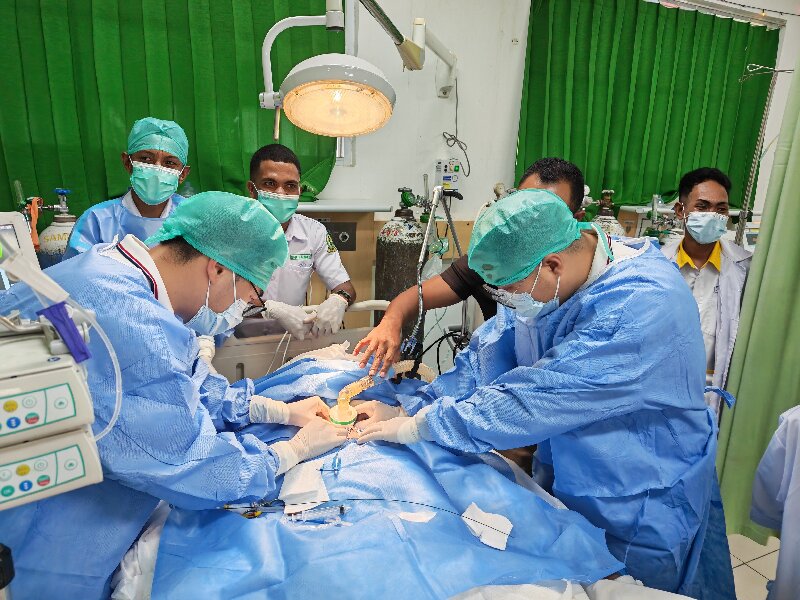 在巴中市人民医院符川主管护师、郭鹏翻译等中国医疗队员的协助下,张鹏主治医师同东帝汶当地医护团队紧密协作、默契配合,顺利为患者实施经皮气管切开术。