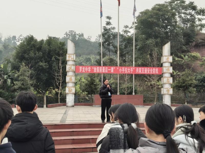 为进一步增强师生交通安全意识,筑牢假期交通安全防线,1月12日上午,罗龙初级中学校联合宜宾市公安局交通警察支队交管六大队,在校园内组织开展了一场以“小手拉大手,共筑安全路”为主题的交通安全专题教育,为全体师生带来了生动而深刻的“放假前最后一课”。